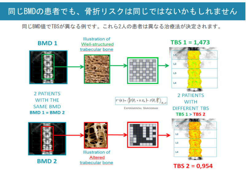 スイスのMedimaps社が開発した”海綿骨構造特性指標TBS:Trabecular Bone Score”を従来の”骨密度BMD:Bone Mineral Density"と併用して評価することにより、同じBMDでも骨折リスクをTBSで判断できるようになります。
